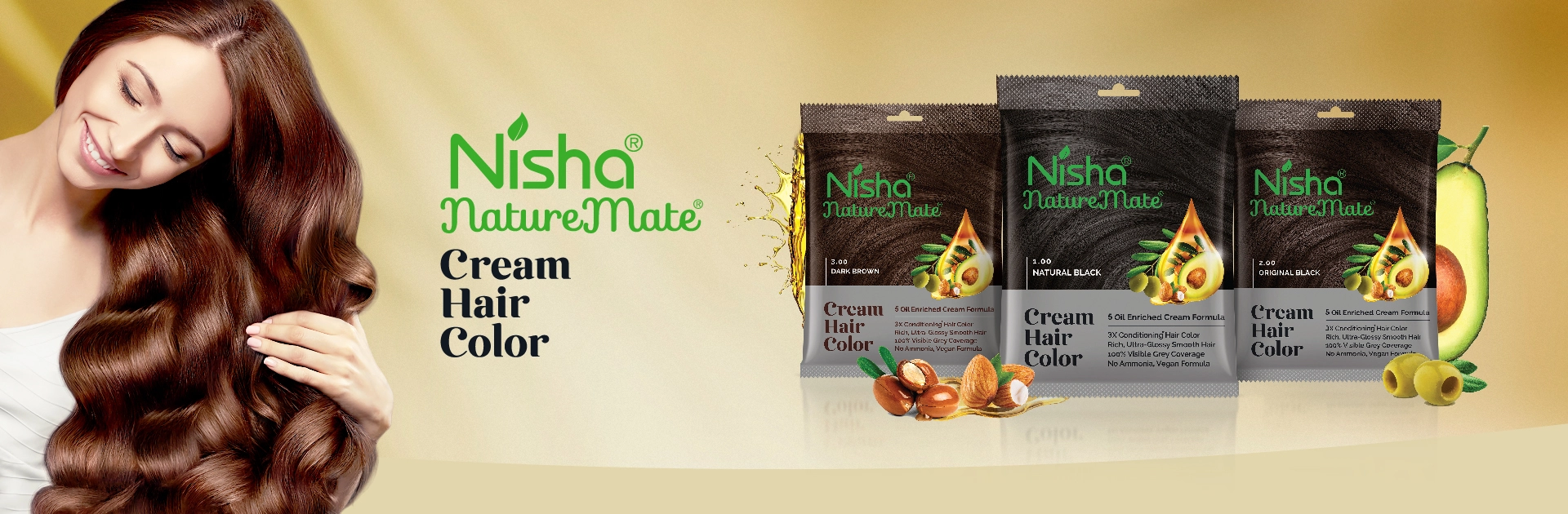 Experience the nourishing power of Nisha Naturemate Cream Hair Color, crafted to provide 100% visible grey coverage while deeply conditioning your hair. Enriched with a unique “5-oil enriched cream formula”, it delivers rich, ultra-glossy hair that feels soft, smooth, and healthy from root to tip.